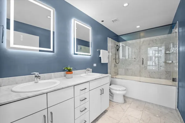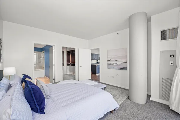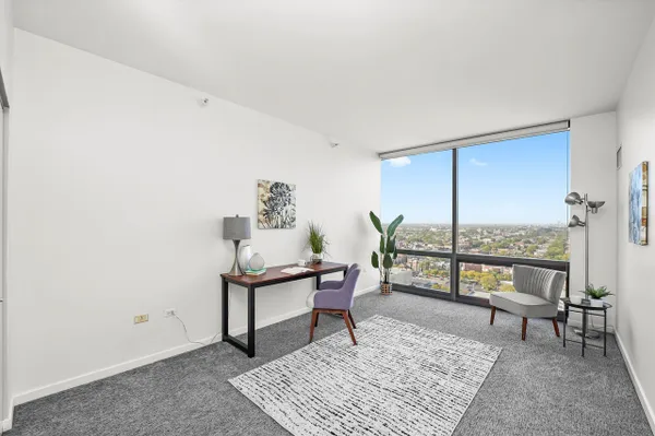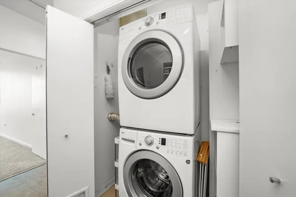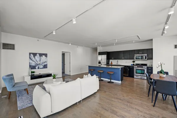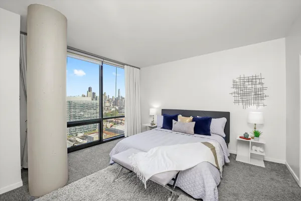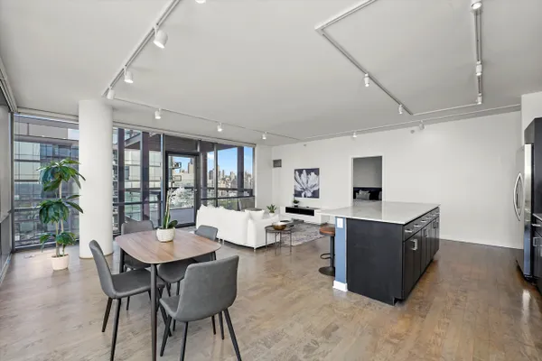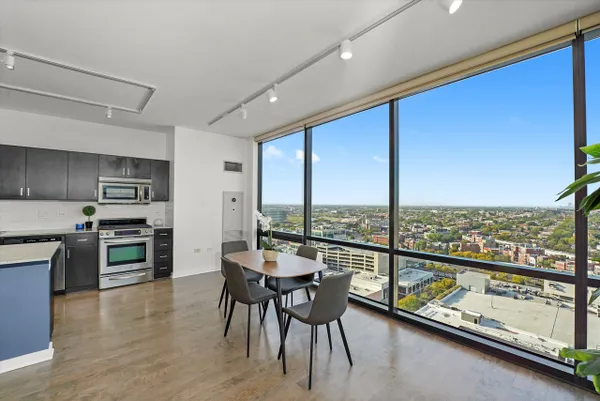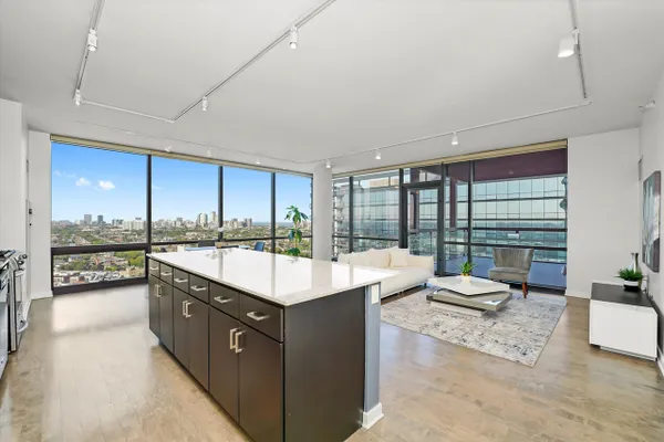 Prepare to be captivated by breathtaking, unobstructed skyline views in this highly coveted 2-bedroom, 2-bath corner unit at SoNo West. Spanning 1,436 sq ft, this stunning home features floor-to-ceiling windows that showcase panoramic views of the iconic Chicago skyline and partial lake views, offering unforgettable sunsets right from your living room. Inside, the open-concept layout effortlessly connects the living, dining, and kitchen areas-perfect for modern living and entertaining. A standout feature of this condo is the expansive balcony, ideal for hosting gatherings, enjoying your morning coffee, or simply taking in the cityscape. The spacious primary suite boasts a generous walk-in closet and a spa-like ensuite bath with a double vanity. The large kitchen features a massive island with seating, stainless steel appliances, ample counter space, and an additional walk-in pantry for storage. Additional conveniences include an in-unit washer and dryer, TWO side-by-side garage parking spaces, and a storage unit-all included in the price. SoNo West offers a well-managed HOA with strong reserves, a fully equipped gym with Peloton, 24/7 door staff, on-site management and maintenance, lightning-fast internet, and a full cable package with HBO included in the assessments. Enjoy a vibrant neighborhood full of curated boutiques, lively cafes, art galleries, and award-winning restaurants. Located in top-rated school districts, the area is also pet-friendly, featuring walkable streets and green spaces. Experience the very best of Chicago's food, art, education, and lifestyle-just steps from your front door. Explore in 3D-click the virtual tour to see every detail!